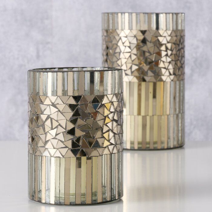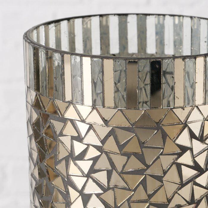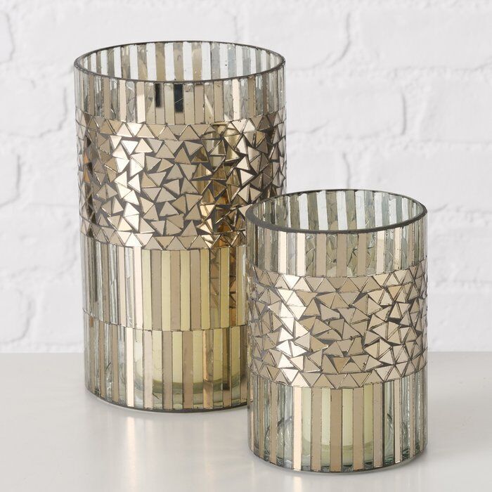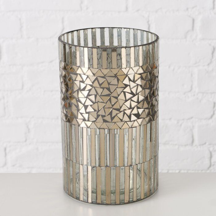Windlicht Sika besticht durch seine filigrane Mosaikoptik aus silbernen, glänzenden Mosaiksteinen. Durch das klare Glas kann das Licht der Kerze scheinen und die Umgebung in ein stimmungsvolles Licht tauchen. Windlicht Silka bieten Platz für kleine bis mittlere Stumpenkerzen oder auch Teelichter und wird in Handarbeit hergestellt.