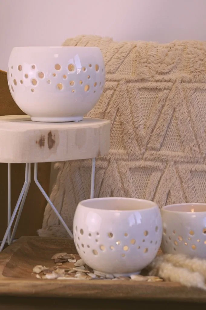 Durch seine fein gearbeitete Löcherstruktur, durch die das warme Licht der Kerze scheint, zeigt das Windlicht Selina die Handwerkskunst der Töpfer. Kleine Löcher wurden mit viel Liebe zum Detail in den Ton eingefasst und sorgen somit für eine zauberhafte Beleuchtung an einem Sommerabend oder für ein angenehmes, gemütliches Gefühl in der dunklen Jahreszeit. Farbe: creme-weiß, glasiertBreite: 13 cmInnendurchmesser: 10 cmMaterial: Keramik